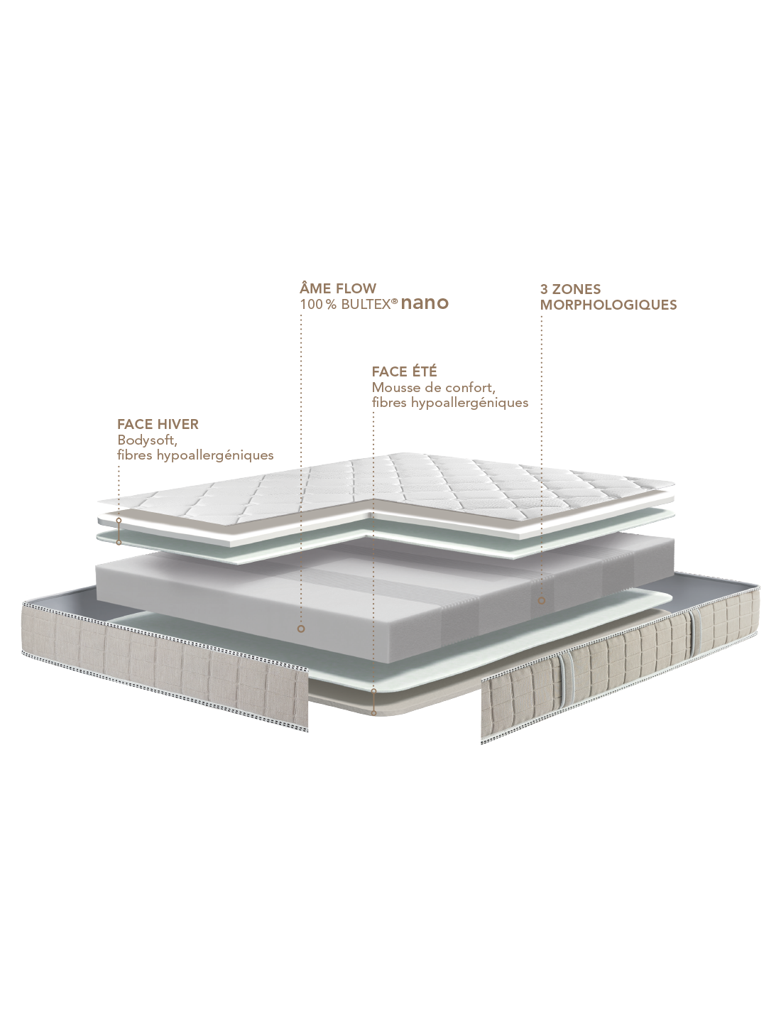 • Âme principale : 15 cm de mousse FLOW nano 33 kg/m³ (5 % d’origine durable)