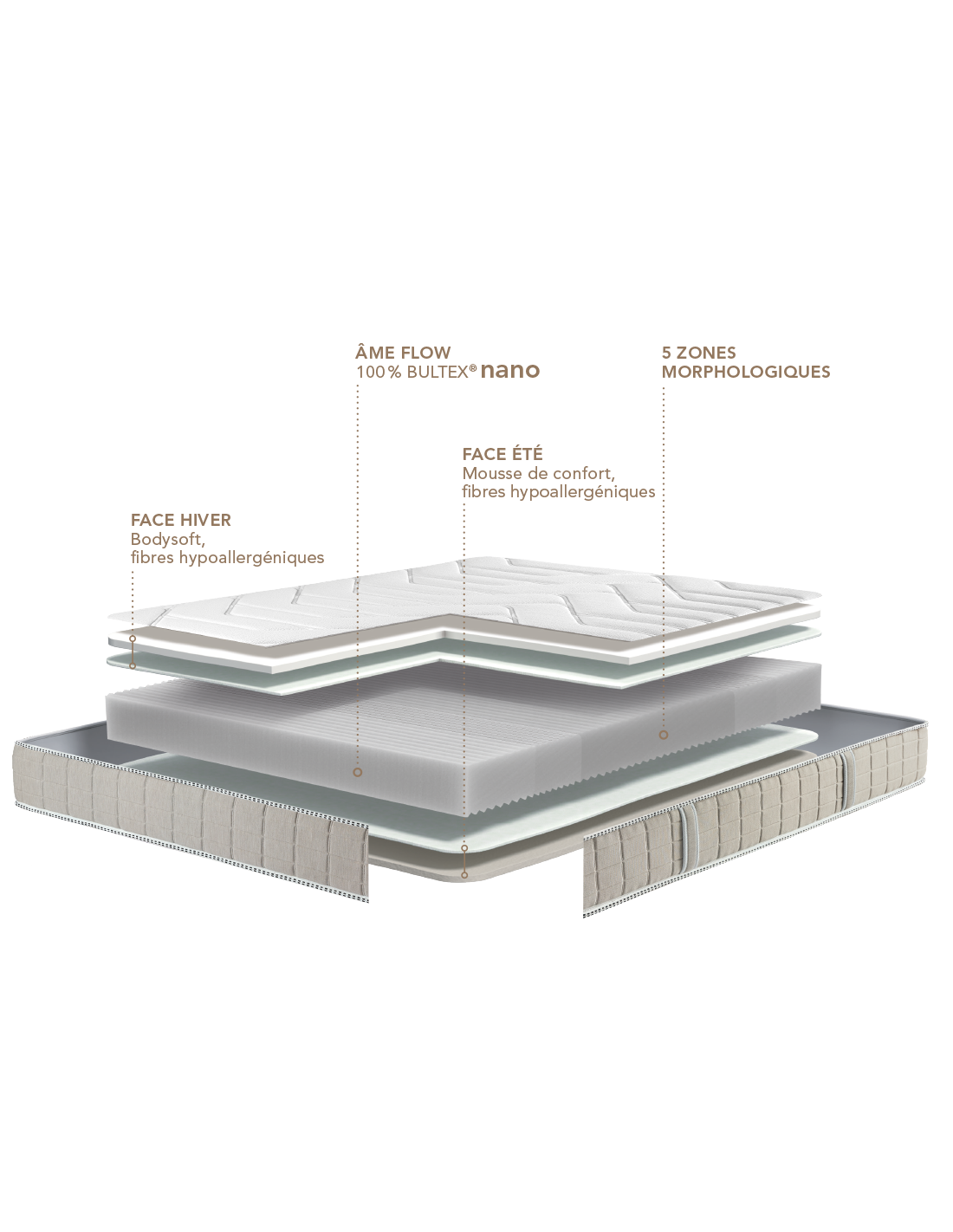 Matelas Bultex® Analogie équilibré, 23 cm, âme FLOW nano 33 kg/m³ + bodysoft. Accueil moelleux, soutien morphologique, 5 zones de confort. Très bonne indépendance de couchage, réversible été/hiver. Tissu stretch certifié OEKO-TEX®, traitement Phyto-Activ’ sans biocide. Fabrication française, mousse durable et respirante. Idéal pour un sommeil sain et enveloppant.