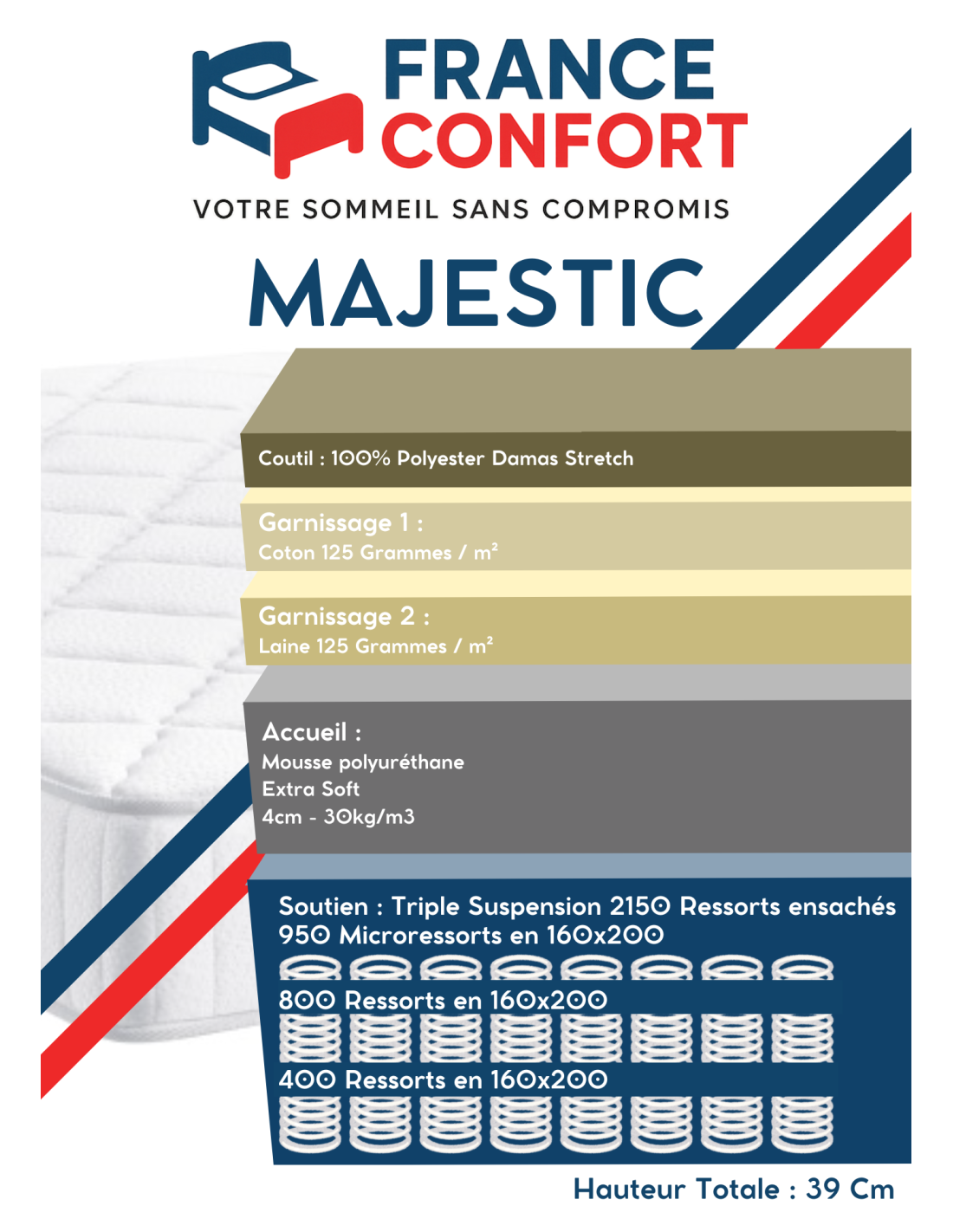 Le matelas Majestic de France Confort offre un accueil très enveloppant grâce à sa mousse Hyper Soft et son surmatelas intégré. Son soutien point par point est assuré par 2150 ressorts ensachés sur trois hauteurs et une mousse haute densité. Finition haut de gamme avec coutil Damastretch brodé, 6 poignées et une hauteur de 39 cm.